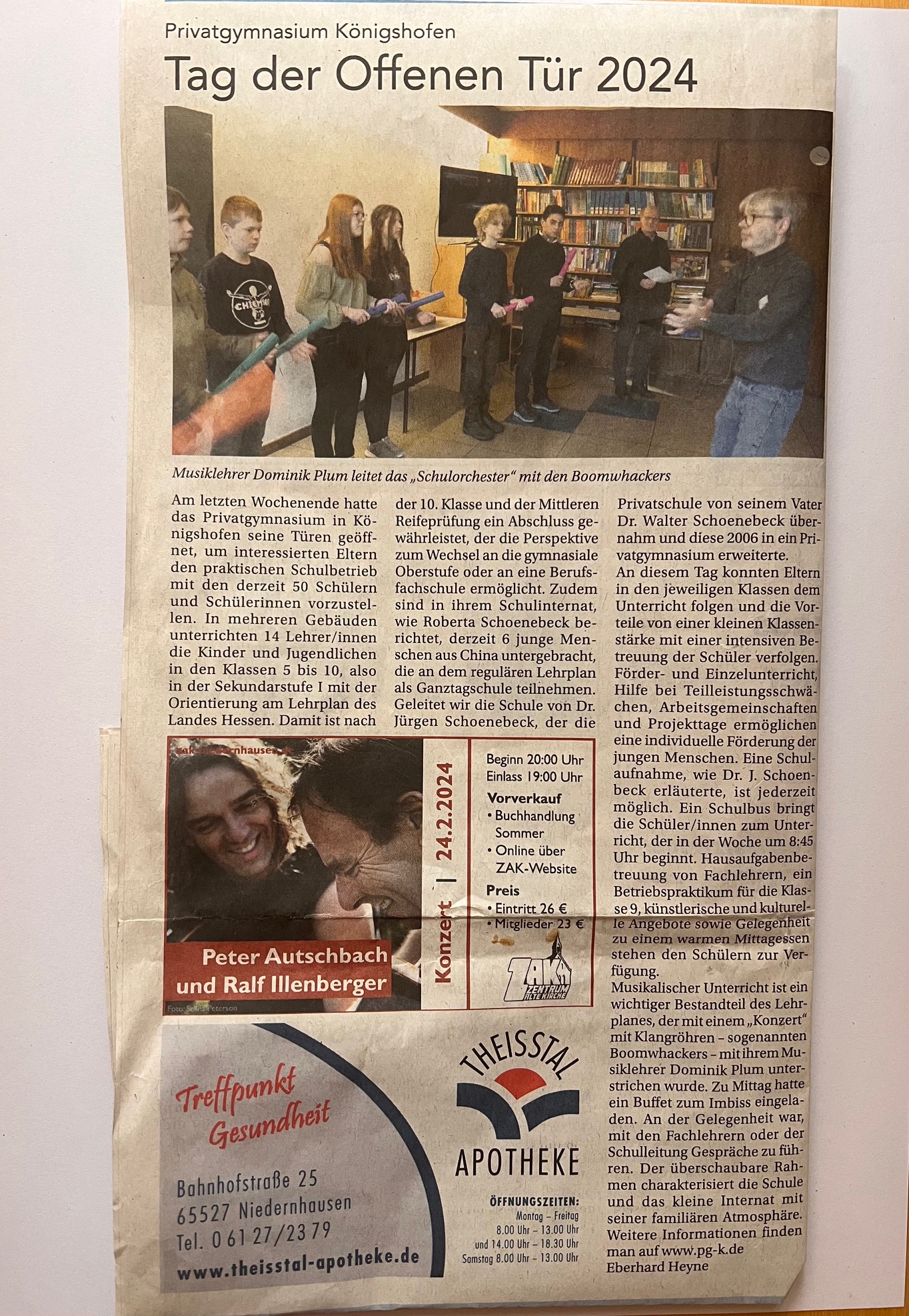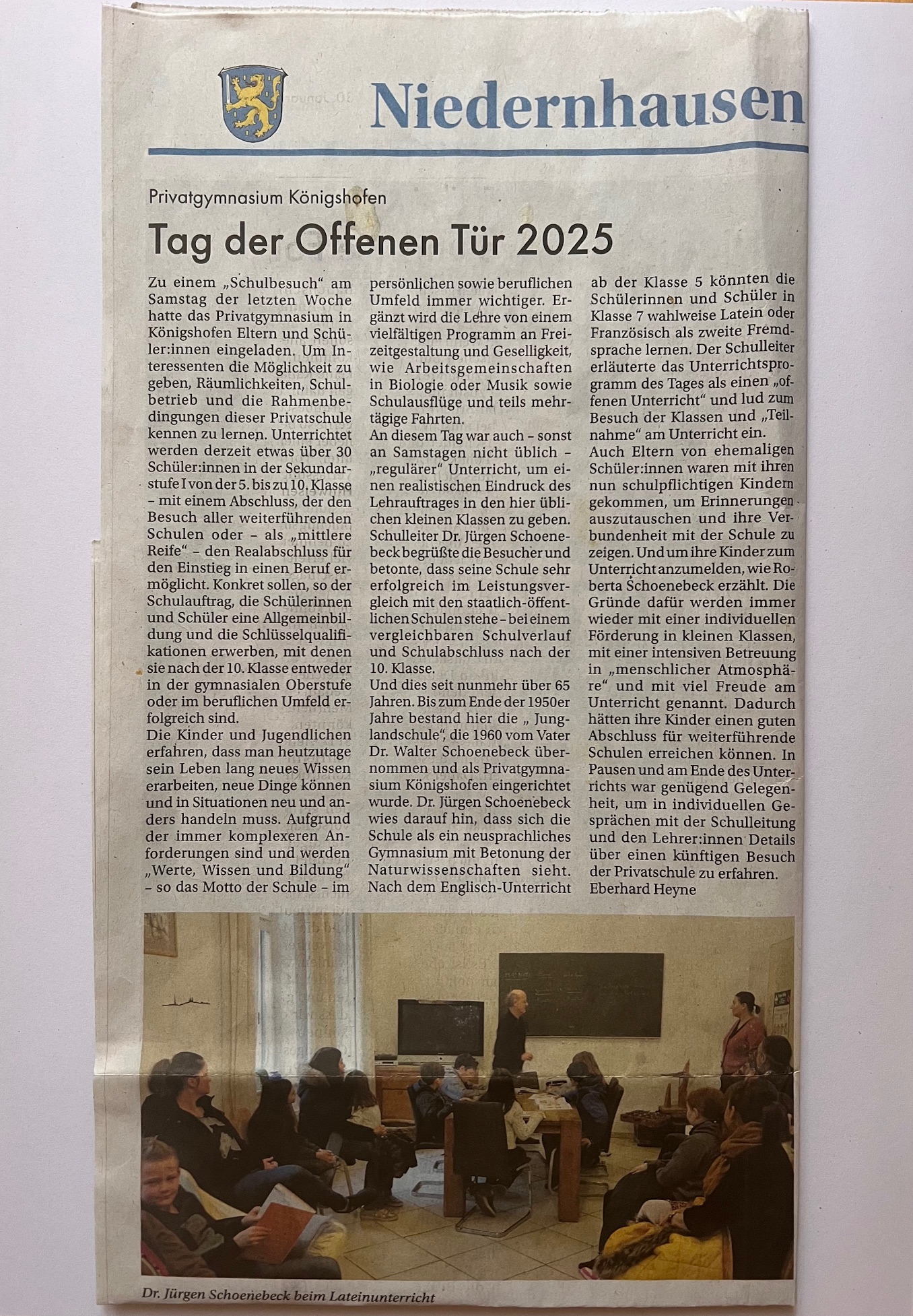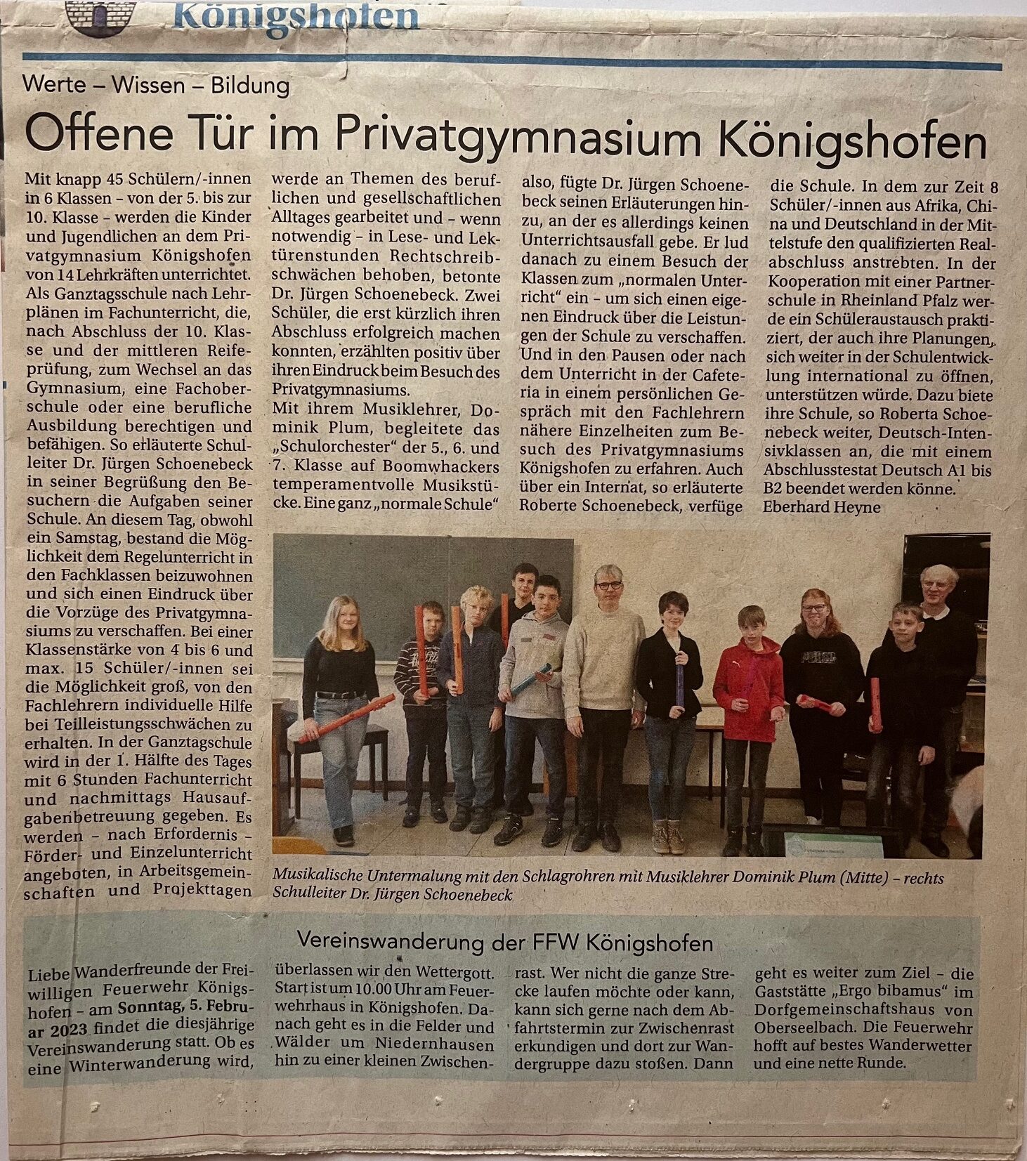 An diesem Tag wollen wir Ihnen einen Einblick in den Schulalltag geben, damit Sie sich ein Bild davon machen können, was die Kinder und Jugendliche heutzutage in der Schule leisten müssen. Das Privatgymnasium Königshofen vermeidet die Anonymität in großen Klassen und bildet von Klasse 5 bis 10 Lerngruppen mit maximal 15 Schülerinnen und Schüler, um eine individuelle Betreuung zu ermöglichen.